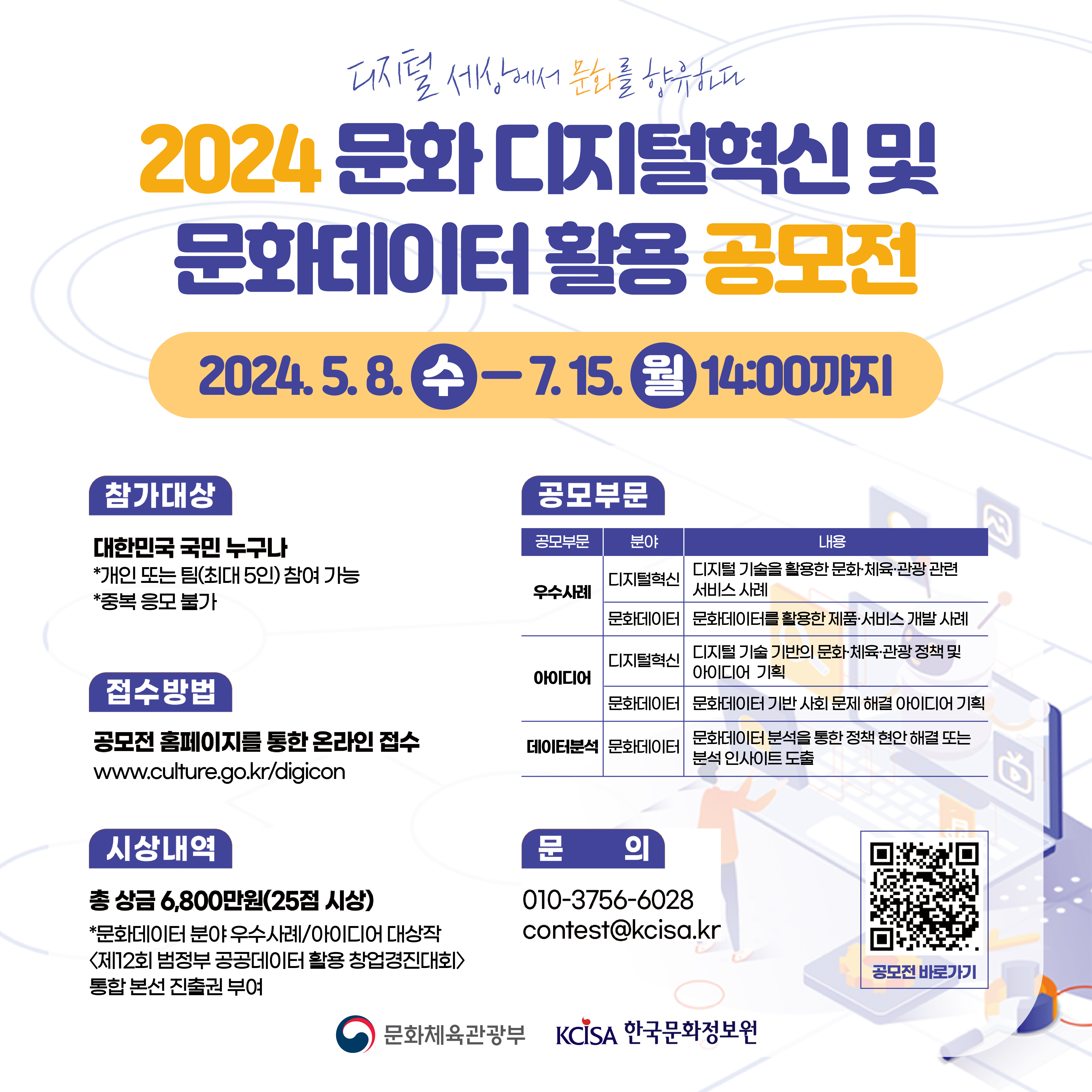 문화체육관광부가 주최, 한국문화정보원이 주관하는 「2024 문화 디지털혁신 및 문화데이터 활용 공모전」이 개최되었습니다.