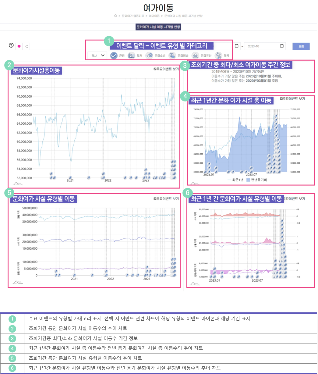 문화여가 시설 총 이동량을 시설 유형별 이동량으로 세분화하여 제시합니다.