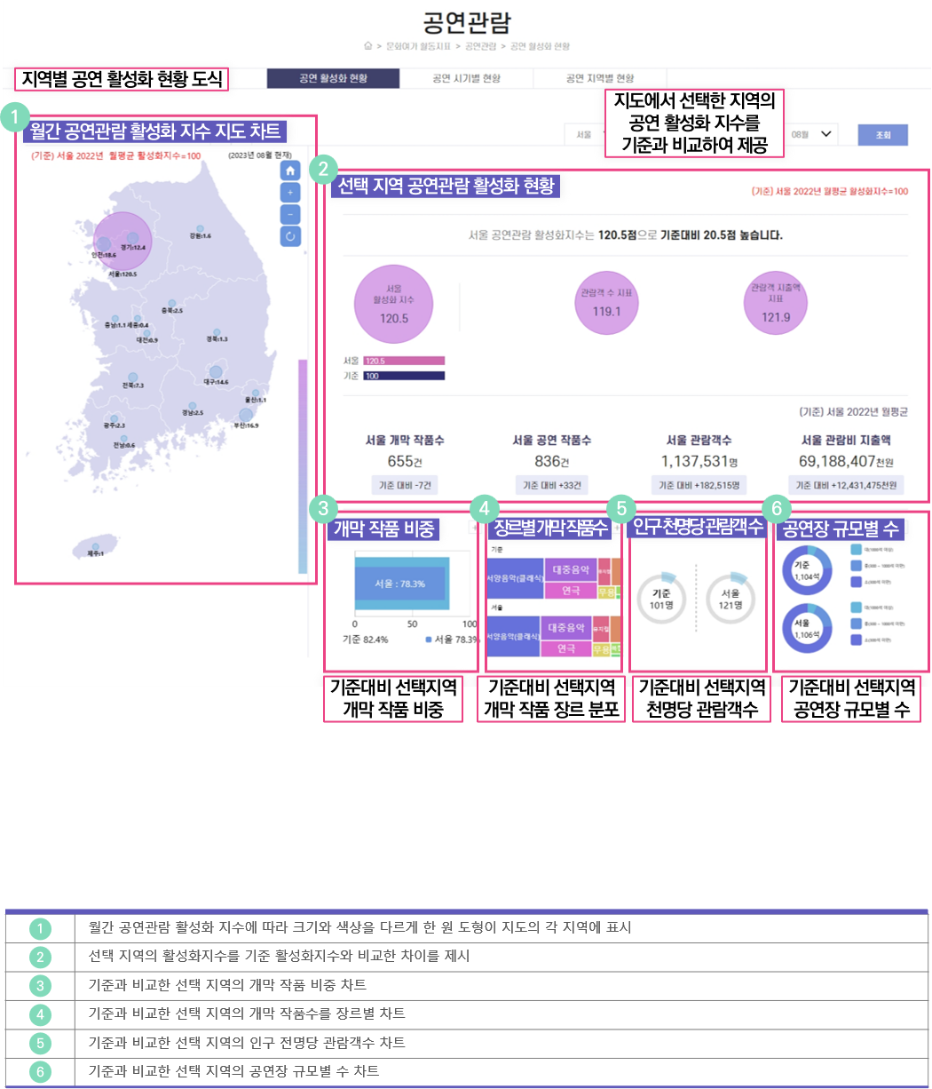 지역별 공연 관람객 수 및 관람객 지출액을 기준대비 상대적으로 비교합니다