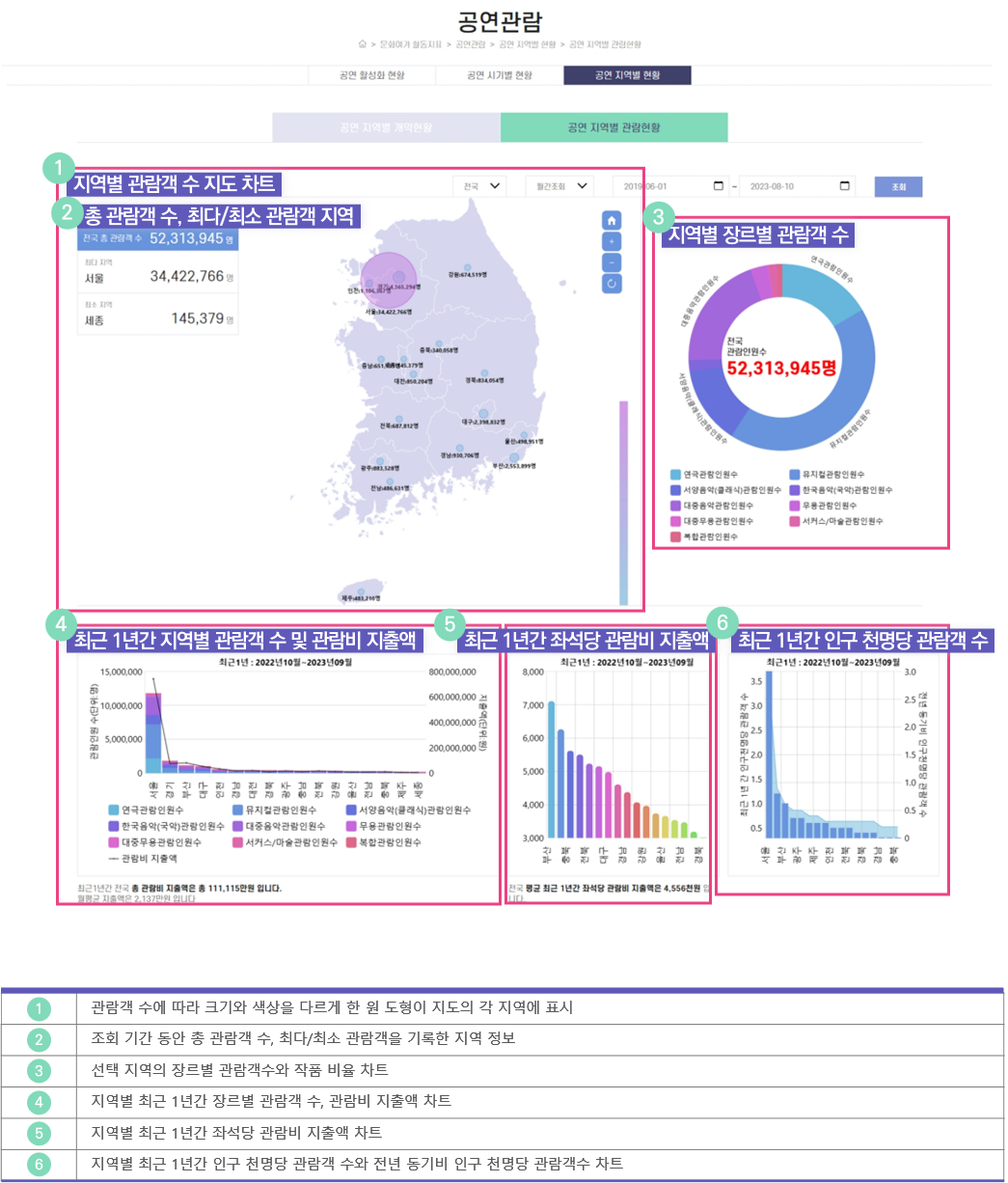 조회 기간 각 지역별 관람객 수 및 장르별 관람객 수의 비중을 보여줍니다.