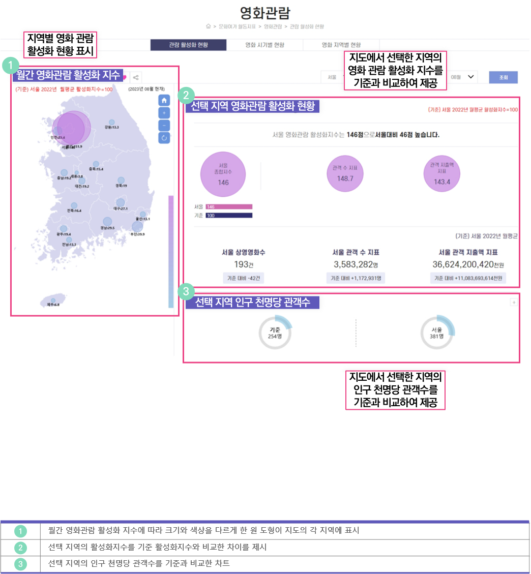 지역별 영화 관객 수 및 관객 지출액을 기준대비 상대적으로 비교합니다