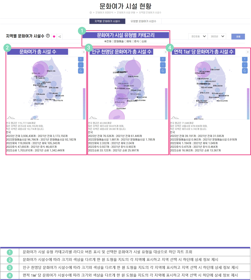 - 위의 지도에서는 문화여가 총 시설 수를 17개 시별로 비교해서 볼 수 있고, 시설 유형별(문화예술, 체육, 휴식, 소비) 시설 수도 선택해서 볼 수 있습니다.