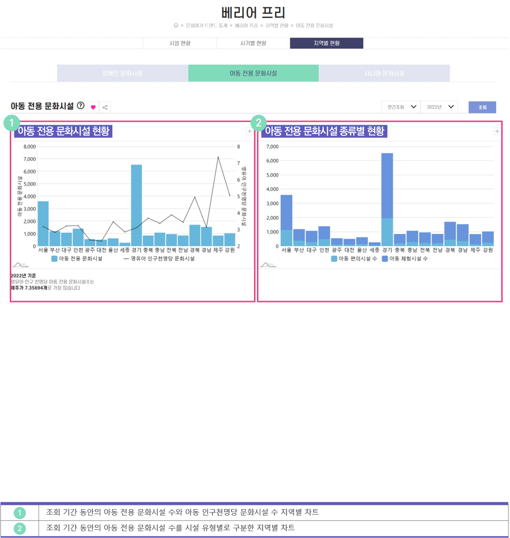 조회 기간의 지역별, 시설종류별 아동 전용 문화여가 시설 수를 보여줍니다.